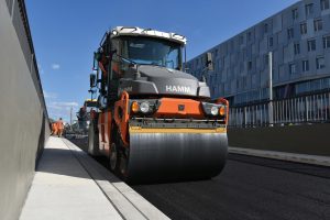 O turnare curată și precisă a asfaltului este importantă, dar și precompactarea acestuia este, de asemenea, decisivă: pentru tunelul rutier Karlsruhe s-au folosit plăcile extensibile AB 500 și AB 600, ambele echipate cu grupuri proprii de compactare cu vibrare. Ca urmare, finisoarele au reușit să realizeze o precompactare puternică, care a redus numărul de treceri necesare pentru compactoarele utilizate ulterior.