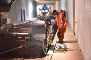 Turnarea asfaltului în tuneluri a avut loc în două etape. Pentru prima etapă, foarte scurtă ca și timp, a fost adaptat procesul de așternere și schemele de compactare pentru ca asfaltul livrat la temperatură joasă să fie rapid pus în operă. Betonul bituminos la temperatură joasă poate fi prelucrat o perioadă relativ lungă de timp, dar la un moment dat devine brusc rigid. De fapt, această creștere bruscă a rigidității sale complică operațiunile de compactare și reprezintă una dintre principalele diferențe comparativ cu turnarea asfaltului fierbinte normal. Astfel, compactarea într-un interval de timp corect devine esențială pentru a obține o suprafață de rulare de înaltă calitate.
