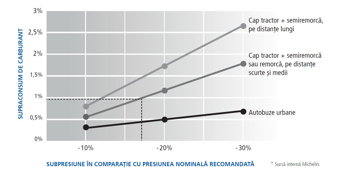 Presiunea de umflare are o influență dovedită asupra consumului de combustibil. O presiune de umflare inadecvată crește rezistența la rulare a anvelopelor și, prin urmare, consumul de combustibil al vehiculului.