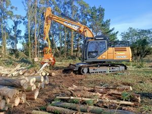 Mergând spre sudul Europei, tot în domeniul forestier, de data aceasta întâlnim la lucru un excavator pe șenile CASE CX210D. Acesta este echipat cu un accesoriu forestier utilizat pentru prelucrarea lemnului de pin și eucalipt. De această dată, fiind vorba de o recoltare de material lemnos special, în afara puterii, precizia de lucru este esențială. Deoarece materialul lemnos este destinat unui mare producător de pulpă de eucalipt și energie regenerabilă din biomasă, care utilizează reziduuri de plante și deșeuri pentru a crea energie curată, livrarea de material verde trebuie să fie constantă și fără pauză, iar excavatorul CASE CX210D sa dovedit foarte rezistent în condițiile unei exploatări forestiere, în plus timpii de întrerupere pentru întreținerea periodică au fost foarte scurți.