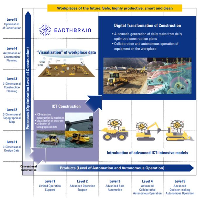Planul de management pe termen mediu (trei ani) al companiei japoneze Komatsu urmărește dezvoltarea unor tehnologii și utilaje curate, nepoluante, care să asigure o siguranță deplină a locurilor de muncă, să fie extrem de productive și inteligente. Pentru a realiza acest deziderat, în următorii ani se vor dezvolta game de utilaje care vor pune accentul pe automatizare și autonomie, dar şi pe dezvoltarea proceselor de producție pentru o optimizare eficientă a lucrărilor de construcţii.