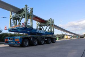 Pentru transportul palelor de turbine eoliene extra-lungi, Hofmann Kran-Vermietung GmbH & Co. KG din Paderborn folosește acum noul transportor de lame “BLADES” în combinație cu sistemul de transport tip dolly dezvoltata de către producătorul european de semiremorci Goldhofer.